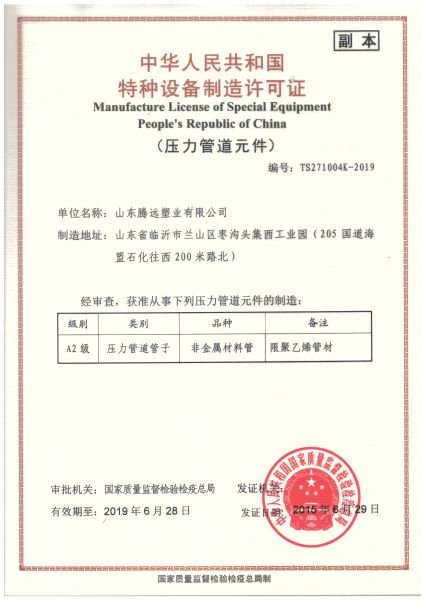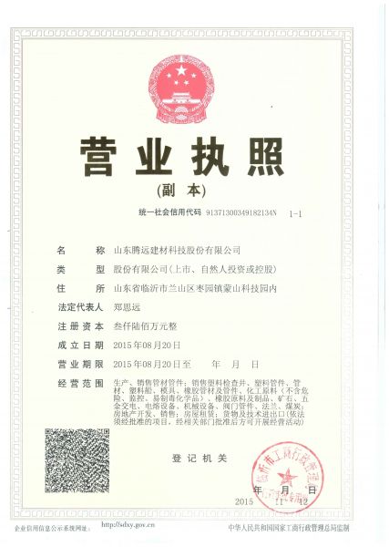 腾远股份,旗下下设山东腾远塑业有限公司、山东联邦塑胶股份有限公司,拥有有山东、河北、辽宁、甘肃、湖南五大生产基地,专业生产PE给水管材、PE燃气管材及PE阻燃、抗静电矿用管材、PE地源热泵管材、PE虹吸排水管材、PERT地暖管材以及配套PE给水管件、PE燃气管件、PE阻燃、抗静电矿用双抗管件、PE地源热泵管件、PE喷塑防腐钢法兰片、PE球阀、PERT地暖管件、PE虹吸排水管件等系列产品的高新技术企业。 公司总占地面积300余亩(山东生产基地占地面积80亩),总公司位于山东省临沂市兰山区枣沟头集西工业园,距离临沂河东国际机场仅20公里,建筑面积60000余平方米,拥有固定资产8000多万元,现有员工390多人,专业技术人员36名,工程师12名,高级工程师4名。公司拥有国际先进水平全电脑控制¢20-¢1600各类PE管材生产线32条,拥有专用注塑机以及各种辅助设备90余台套,...... [ 查看详情 ]